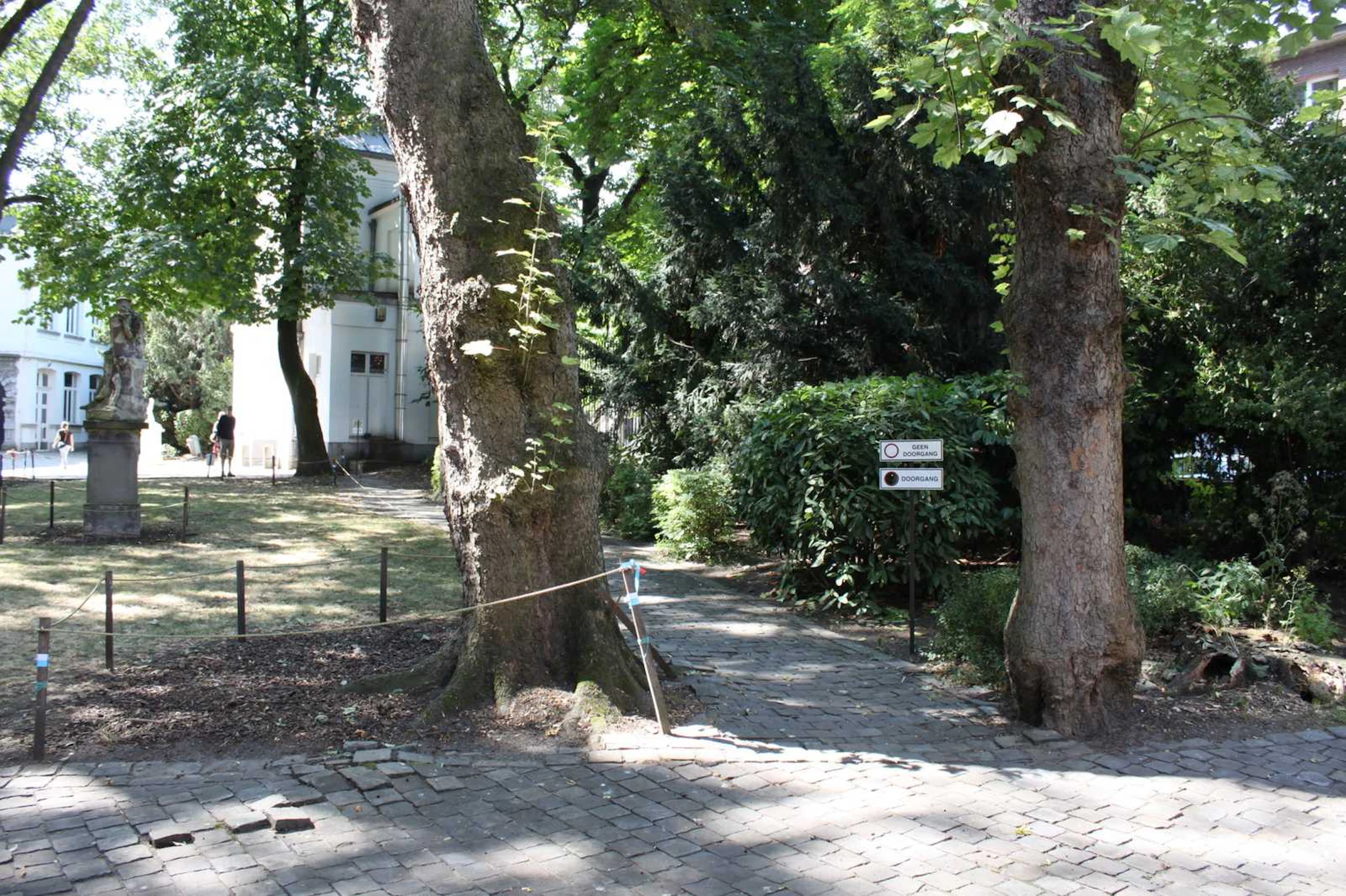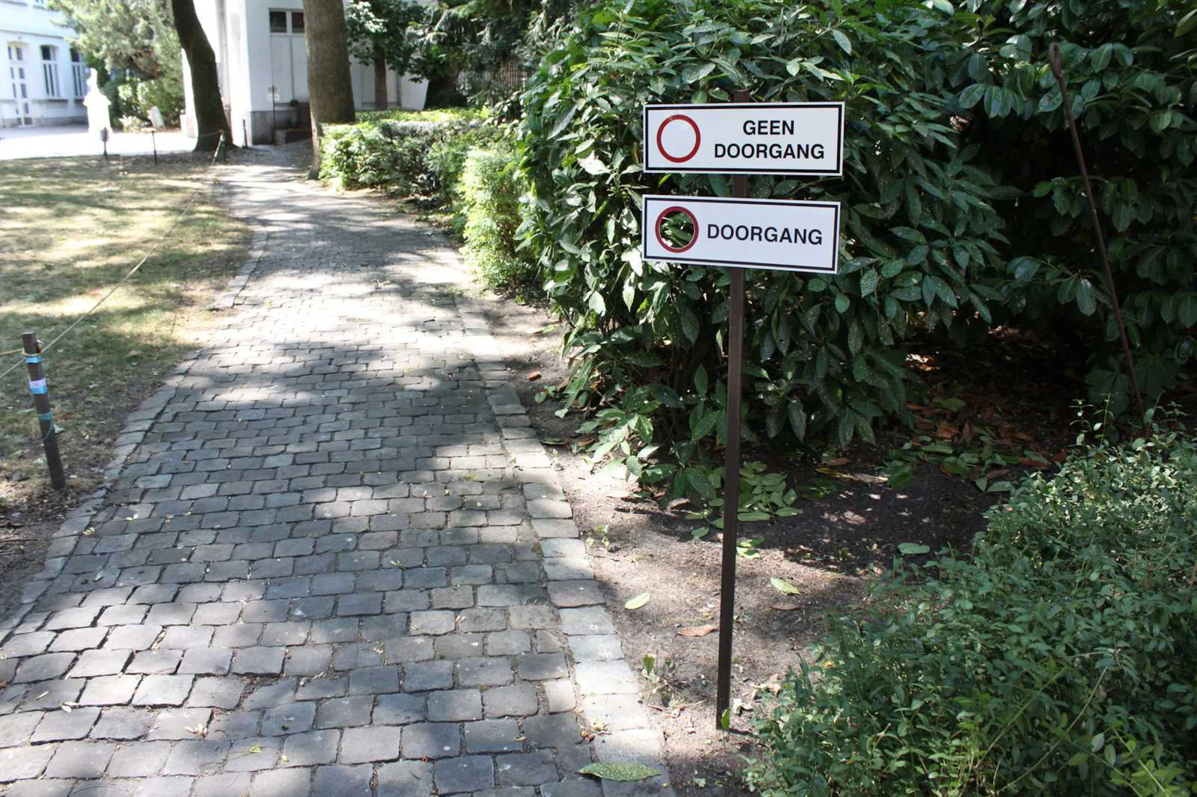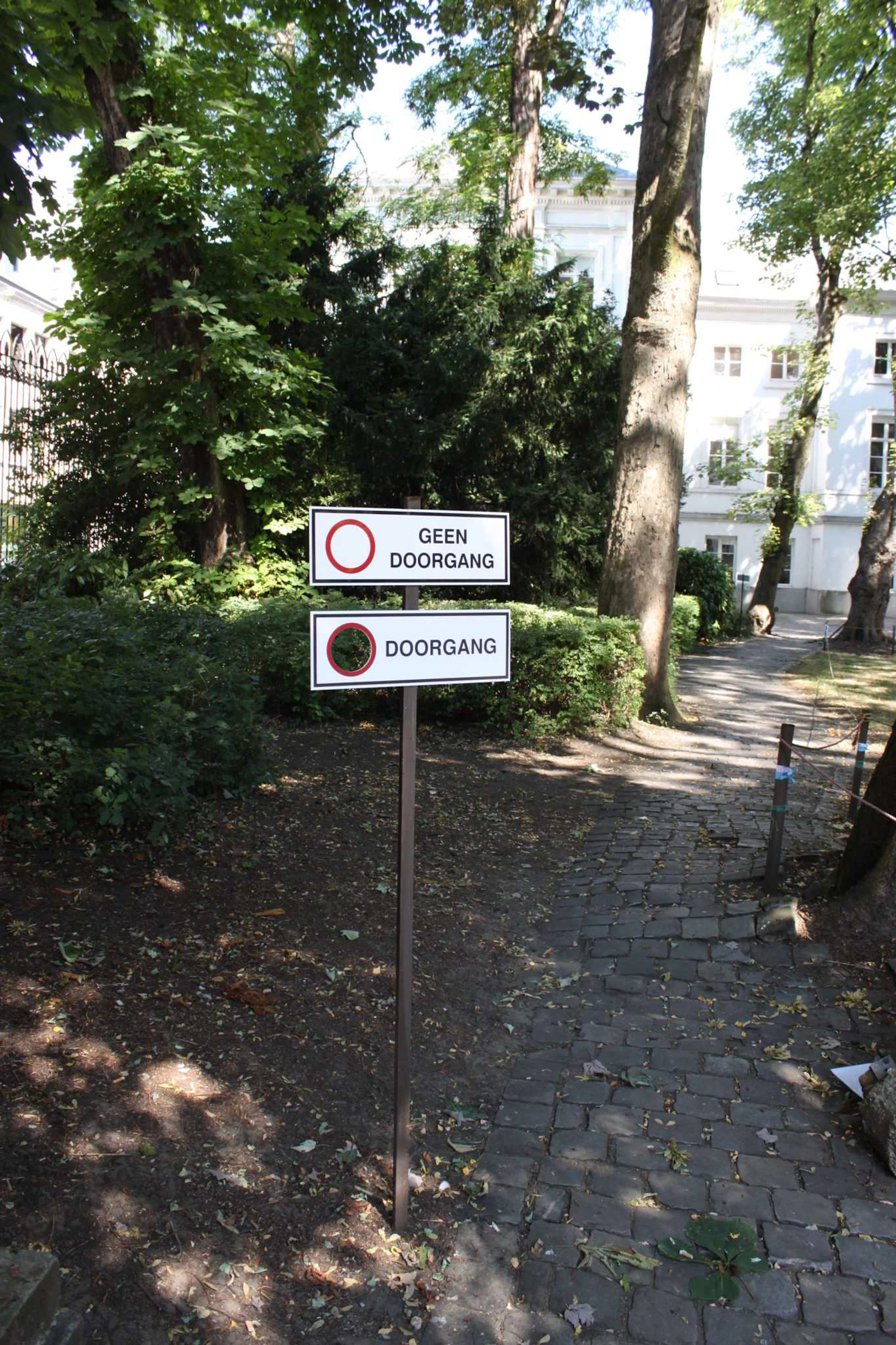 Intervention onto two existing signs in the garden of The Royal Academy of Fine Arts, Antwerp.