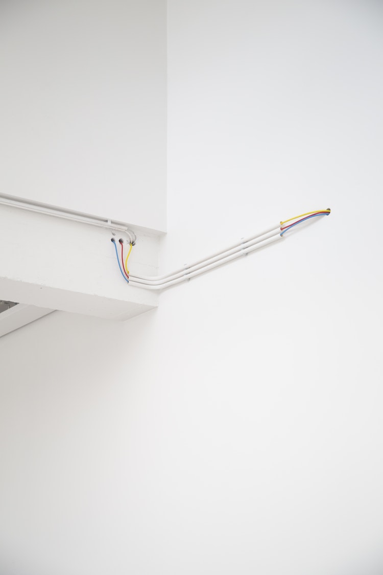 A work deriving from noticing the subtle character of functional tubes, cables and holes that exist on the edge of the white cube area of the space.