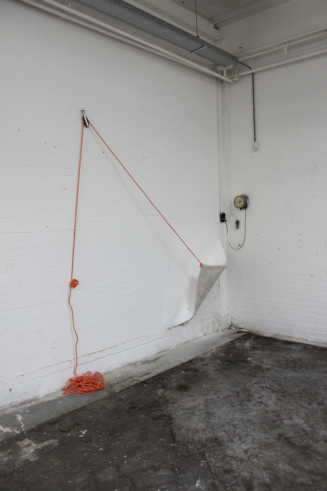 Plaster, pulley, rope, chicken wire, paint.